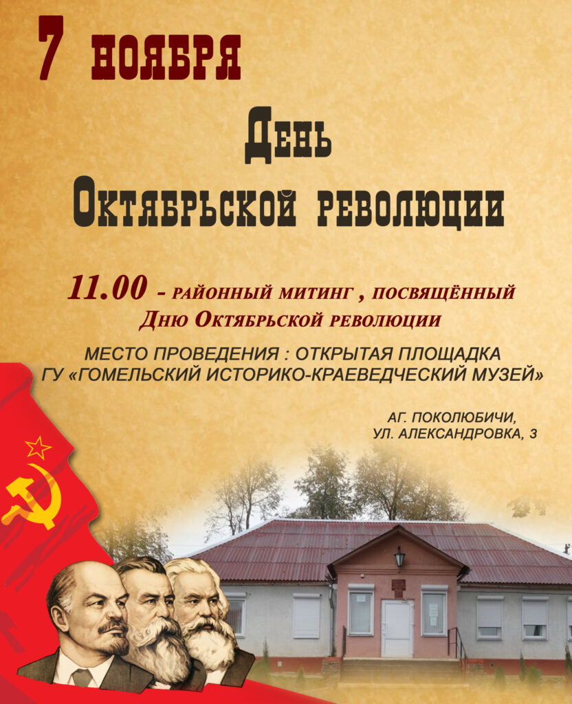 7 ноября в 11:00 пройдет митинг, посвящённый Дню Октябрьской революции на открытой площадке ГУ «Гомельский историко-краеведческий музей» в аг. Поколюбичи.